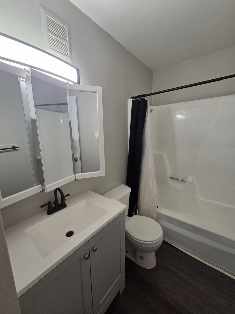 Bathroom: Relax in the shower-tub combo for your convenience.