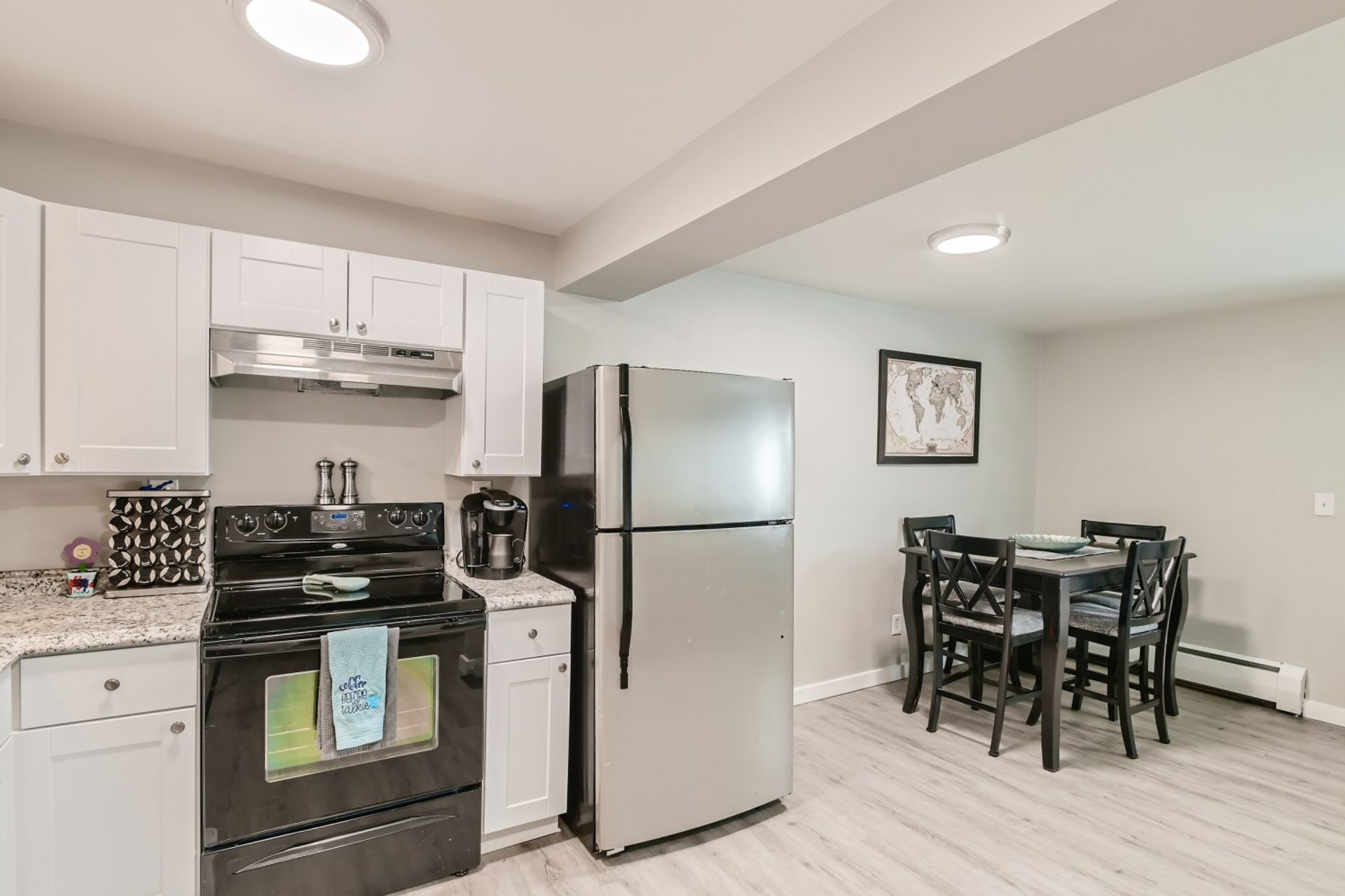Updated kitchen with full-size stainless-steel appliances - oven/stove, refrigerator, dishwasher
